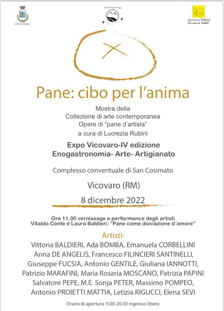 Vicovaro – Ci avviciniamo alla quarta edizione dell’Expo Vicovaro, previsto per l’8 dicembre nel Complesso conventuale di San Cosimato. Tra i vari eventi in programma, si segnala la mostra Pane: cibo per l’anima, curata da Lucrezia Rubini e incentrata su opere di “pane d’artista”, che prevedrà anche la performance Pane come don/azione d’amore di Vitaldo Conte e Laura Baldieri.