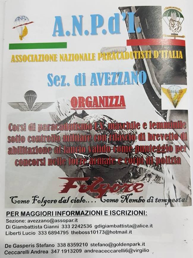 Avezzano – Il Presidente dell’Associazione Nazionale Paracadutisti sezione di Avezzano ha reso che  si sta organizzando un nuovo corso di paracadutismo Fune di vincolo Tondo ad interesse militare con rilascio di abilitazione al lancio ed il relativo punteggio valido per concorsi Forze Armate vfp1 vfp4 ed altro, partirà a breve. Gli interessati troveranno le info sulla locandina allegata.
