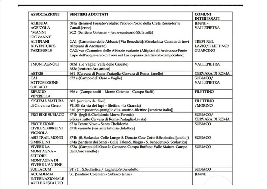 L’elenco dei sentieri adottati e relative associazioni assegnatarie: