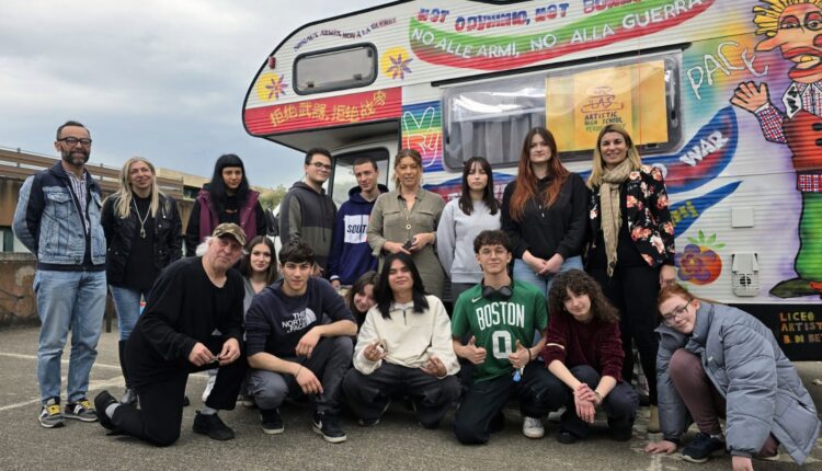 “La classe che ha progettato la nuova veste iconica del camper è stata la V A del dipartimento di Arti Figurative, sotto la guida attenta e scrupolosa della prof.ssa Rita Fortunelli che ha fin da subito appoggiato l’idea visionaria dell’artista di strada Fausto Carloni, nonché proprietario del veicolo che, ispirato dalla figura di Aldo Capitini e dalle iniziative di padre Alex Zanotelli, ha pensato di creare una sua “Carovana della Pace” per portare una concreta testimonianza di pace, dall’Ucraina alla Palestina, partendo da Perugia e coinvolgendo tutta l’Italia e altri paesi europei. L’obiettivo primario vivamente espresso da Fausto Carloni è quello di poter giungere in questi paesi devastati dall’egoismo umano e dall’odio per stare vicini ai bambini prime vittime di queste atroci guerre.