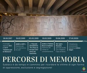 Dal mese di settembre 2018 l’Amministrazione inizia a ipotizzare un progetto di ancor più ampio respiro, lanciando così l’idea dei “Percorsi di Memoria”, ossia un ciclo di incontri pubblici ad alto impatto storico, contenutistico ed emotivo. A febbraio il primo incontro, realizzato in collaborazione con ANED e ANPI, anche questa volta destinato alle scuole. A marzo, durante le Celebrazioni Benedettine 2019, la Fiaccola “Pro Pace et Europa Una” è stata condotta all’interno del campo di concentramento di Auschwitz-Birkenau, dove alla presenza delle rappresentanze di Subiaco, Norcia e Cassino, nonché del Ministro Plenipotenziario polacco Anders, è stata deposta una corona commemorativa in prossimità del Blocco 11. Due settimane dopo, il 19 marzo, Andra e Tatiana Bucci si rendono disponibili ad organizzare insieme ad ANED un incontro pubblico a Subiaco. Oltre 550 ragazzi degli istituti scolastici di Subiaco e dei comuni limitrofi partecipano all’iniziativa. “Un’emozione grandissima” hanno poi commentato le due ospiti, accolte all’interno della Basilica di Sant’Andrea da una folla di giovani inizialmente festanti e successivamente “impietriti” dalla loro testimonianza.