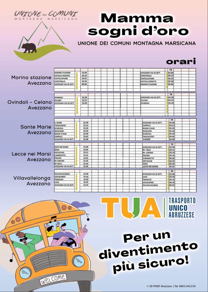 CARSOLI – Mamma sogni d’oro è il titolo di un importante progetto sociale varato dalla nota Unione dei comuni Montagna Marsica in collaborazione con Tua .  Grande esclusa la Piana del Cavaliere da un progetto che dovrebbe, condizionale è d’obbligo, far tirare qualche sospiro di sollievo a genitori dei figli del sabato notte. Indignati molti genitori, e specialmente molte mamme dei comuni della Piana del Cavaliere quindi Carsoli, Oricola, Pereto e Rocca di Botte, in quanto detto lembo di terra non è stato minimamente considerato nel progetto. “Quali siano le motivazioni politiche – afferma un gruppo di genitori – poco ci interessa, sorprende la superficialità e la marginalità con cui viene trattato il nostro territorio, evidentemente le mamme della Piana del Cavaliere invece di fare sogni d’oro dovranno stare preoccupate, in piedi ad attendere il rientro dei loro figli dalle bisbocce del fine settimana”. Mah.
