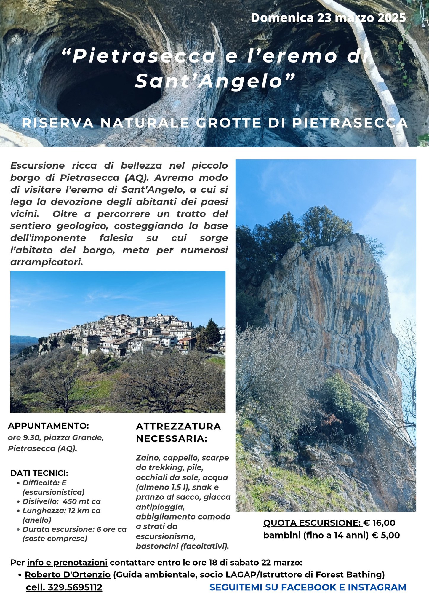 CARSOLI – Una interessante escursione è stata organizzata dalla guida ambientale escursionistica Roberto D’Ortenzio. Il save the date è domenica 23 marzo 2025 il tema è “Pietrasecca e l’eremo di Sant’Angelo”. Il percorso ad anello  è articolato in 8.24 Km.