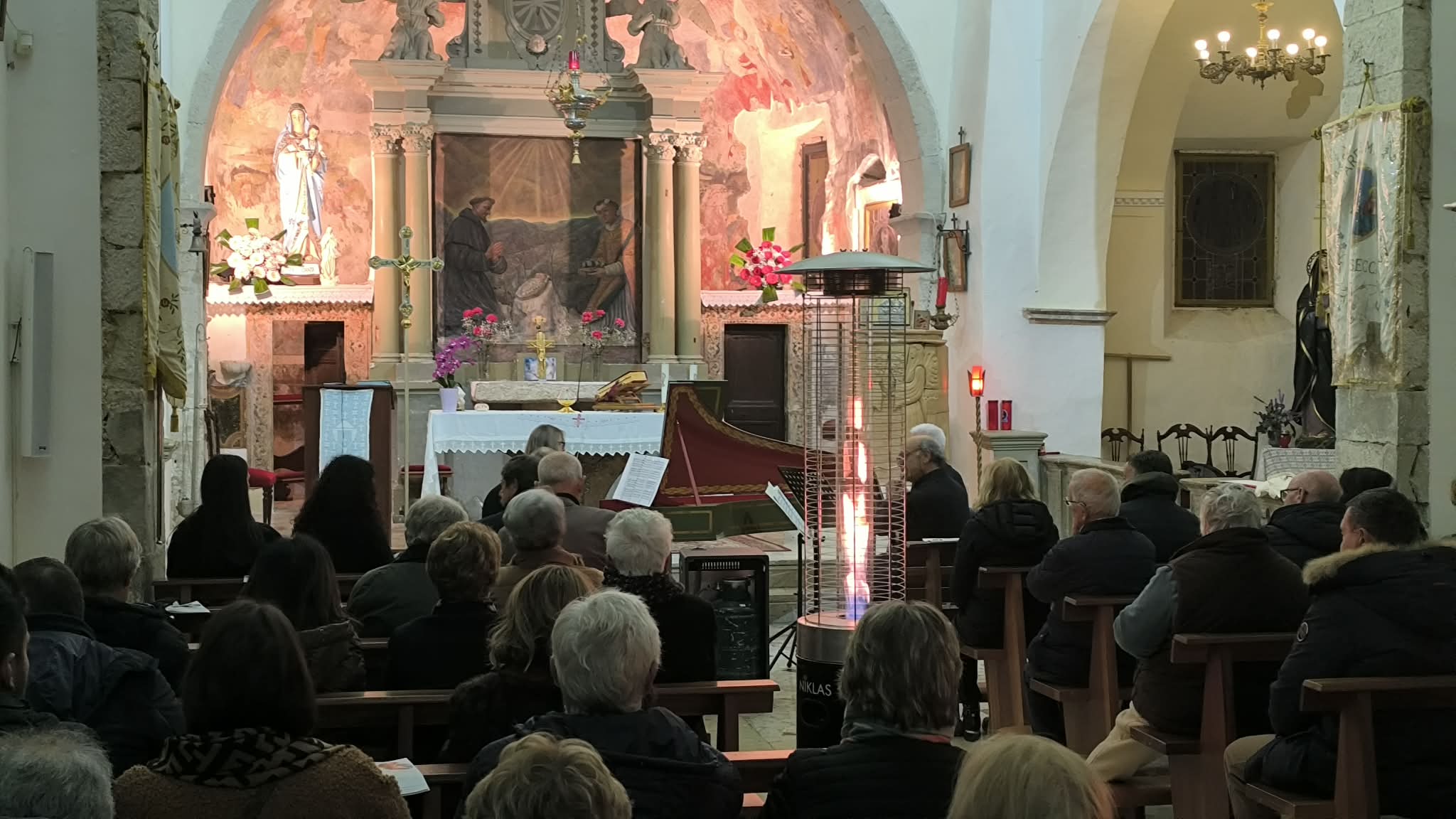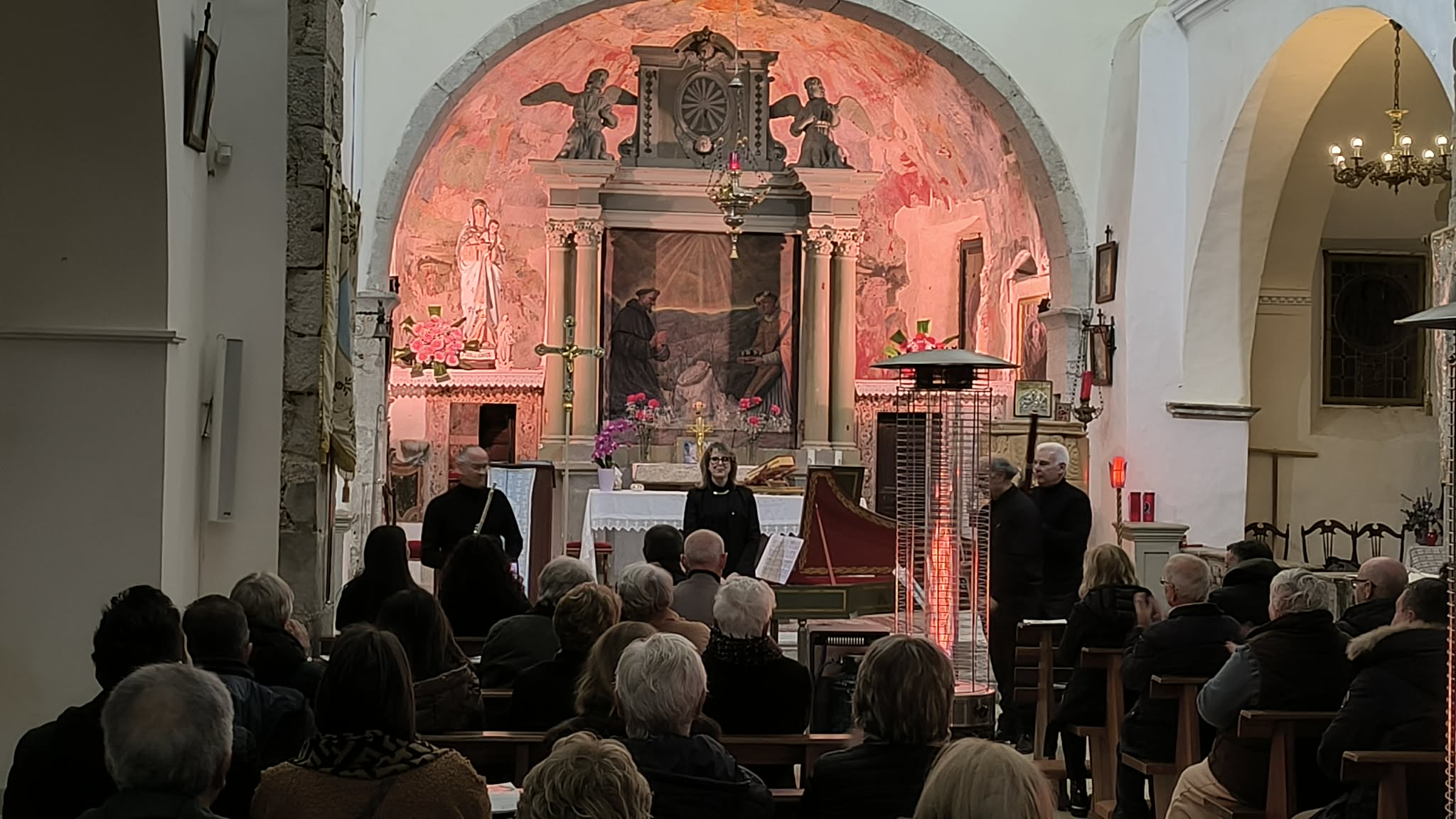 PIETRASECCA – Si è svolto oggi pomeriggio alle 18.30 in punto, nella suggestiva Chiesa di Santa Maria delle Grazie di Pietrasecca, frazione del Comune di Carsoli (AQ), l’evento inaugurale del calendario natalizio promosso dall’Associazione Pietralunare. Un pubblico numeroso ha preso parte a un appuntamento culturale di grande pregio, accolto da un’atmosfera natalizia sorprendente e particolarmente sentita dal borgo. L’introduzione è stata curata dal giornalista Claudio Mele presidente dell’Associazione stessa, alla quale è  seguito il saluto del sindaco di Carsoli Alessandro Marcangeli.