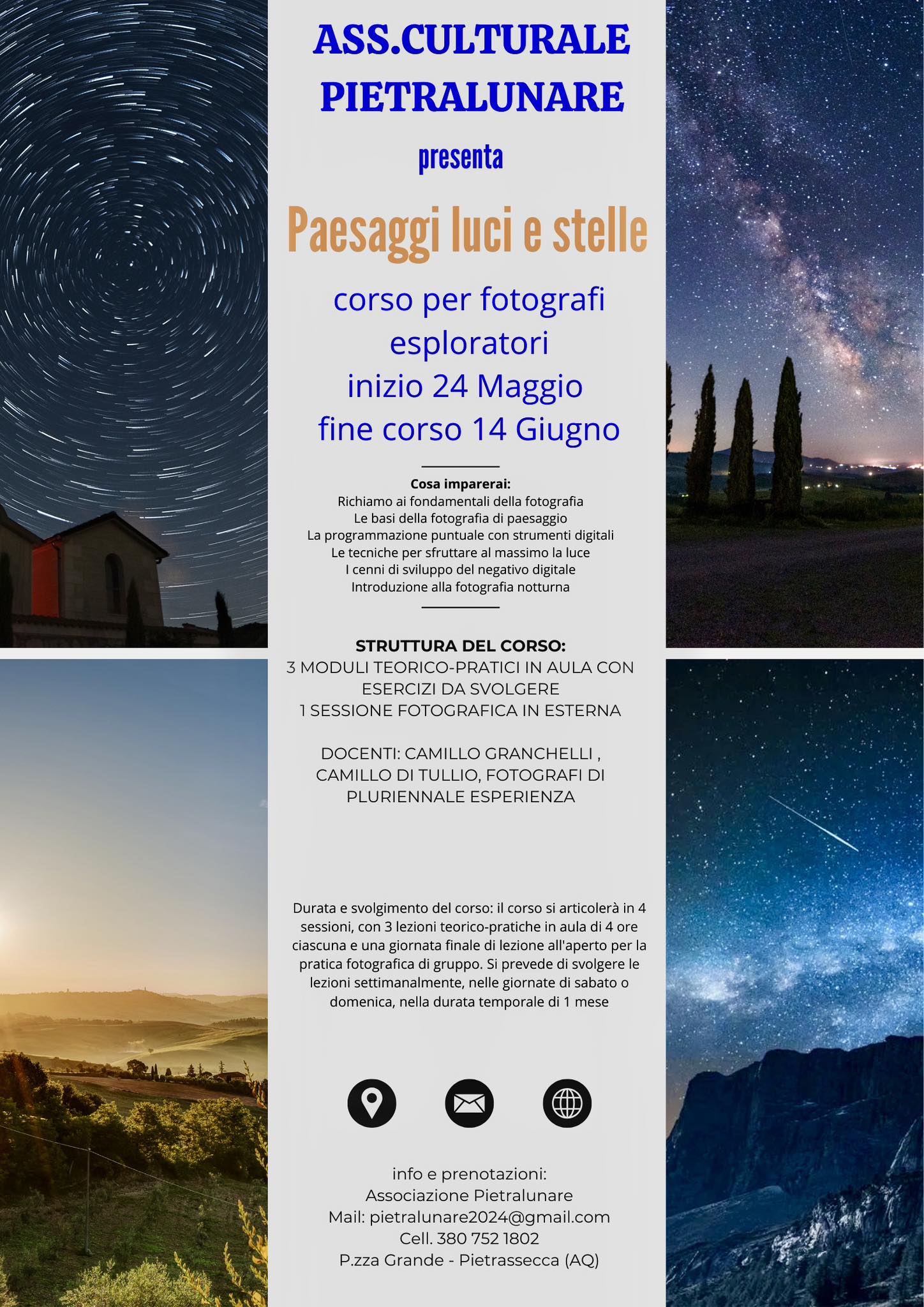 Per capire un po’ di più bisognerà iscriversi al corso fotografico “Paesaggi, Luci e Stelle” che prenderà il via a Pietrasecca il 24 maggio per concludersi dopo 4 moduli il 14 giugno 2025 prossimo.
