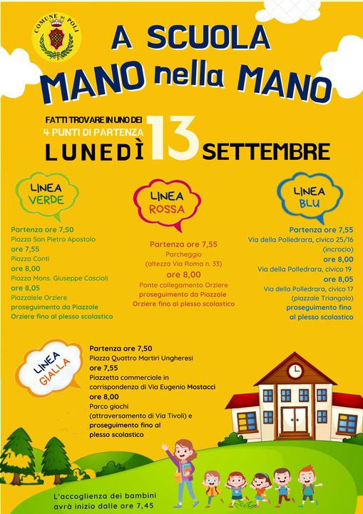Poli – L’Amministrazione comunale, da sempre attenta alla tutela ambientale e allo sviluppo psicofisico di bambine e bambini, inaugura il progetto “A SCUOLA MANO NELLA MANO”, che partirà il 13 settembre con l’inizio dell’anno scolastico.