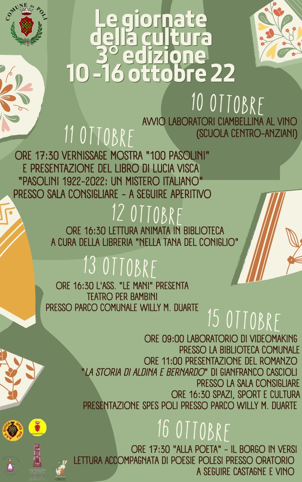 Poli – Con le Giornate della cultura 2022, in programma a Poli, dal 10 al 16 ottobre, si conclude un ciclo di riflessioni sul tema della tradizione, inaugurati con i festeggiamenti tradizionalissimi di Sant’Eustachio ed esaltati da quelli recenti in onore della Madonna del Rosario.