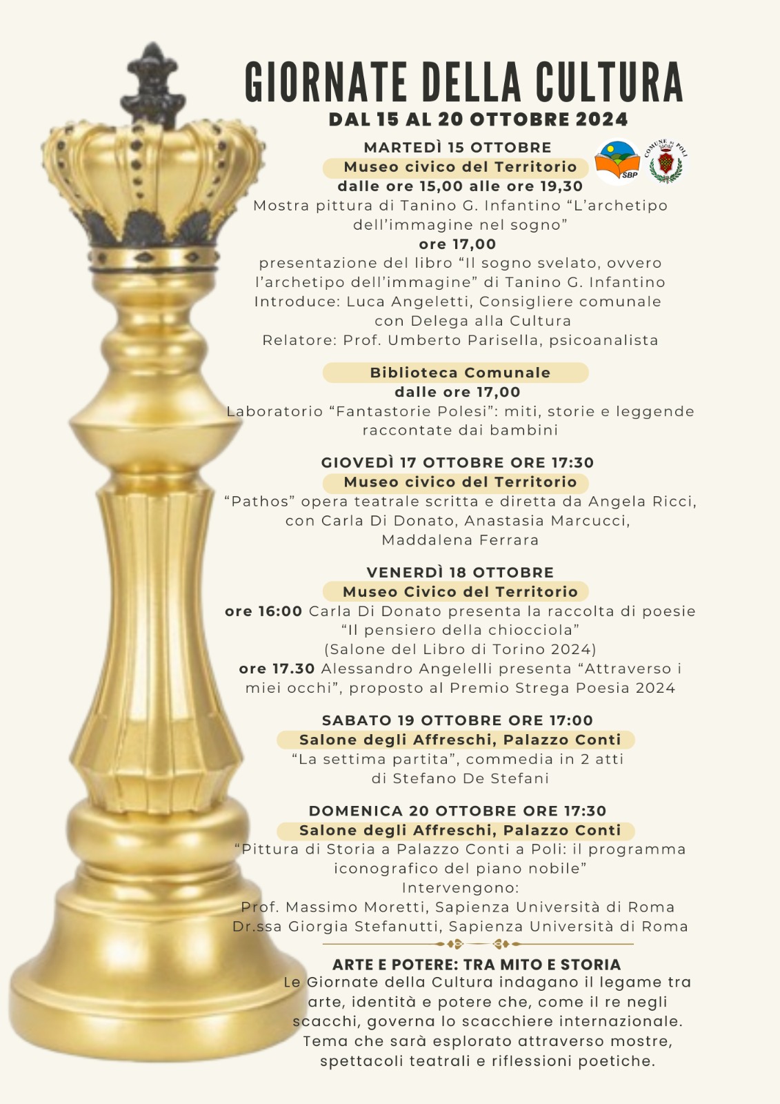 Poli – Le “Giornate della Cultura 2024”, in programma a Poli dal 15 al 20 ottobre, propongono per questa edizione un’importante riflessione sul legame tra arte, identità e potere attraverso una serie di eventi che spaziano dalla pittura al teatro, dalla poesia alle attività per i più giovani. L’iniziativa mira a coinvolgere attivamente la comunità in una settimana dedicata alla valorizzazione delle espressioni artistiche e culturali del territorio.