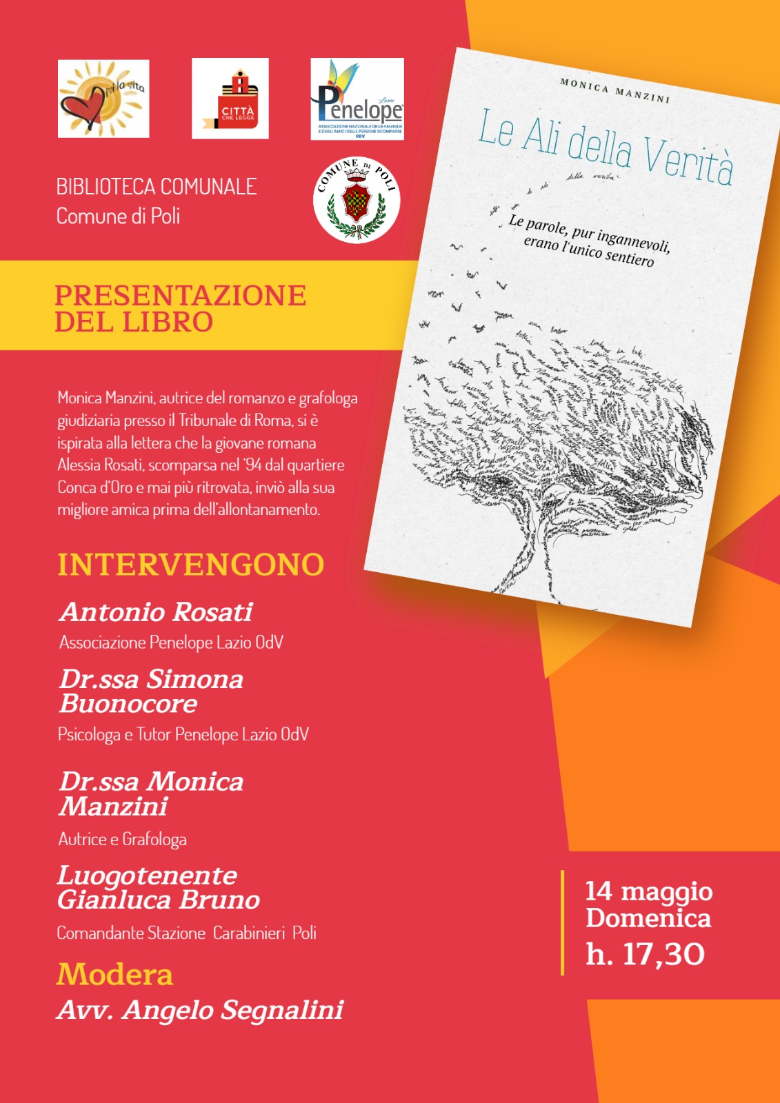 Poli – Domenica 14 maggio alle ore 17.30, presso la Biblioteca comunale di Poli, sarà presentato il romanzo “Le ali della verità” di Monica Manzini, patrocinato dalle Associazioni “Penelope Lazio” e “Vivi la Vita”.