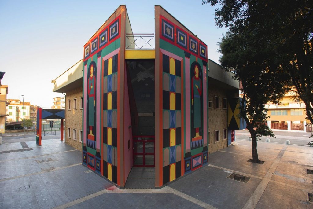Pomezia – Per il progetto Sol Indiges. Arte pubblica a Pomezia tra mito e futuro da oggi è visibile L’antiporta, il grande murale realizzato dall’artista Agostino Iacurci sulle pareti esterne della Biblioteca comunale Ugo Tognazzi a Pomezia.