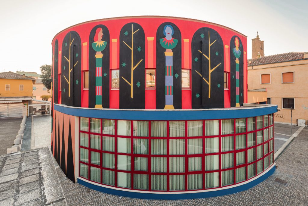 L’antiporta è il titolo del grande murale (1000 mq circa) che Agostino Iacurci ha realizzato seguendo le linee dettate dall’architettura della Biblioteca Comunale Ugo Tognazzi, proponendo un’inedita lettura dell’edificio e un nuovo ruolo nel percorso narrativo della città.