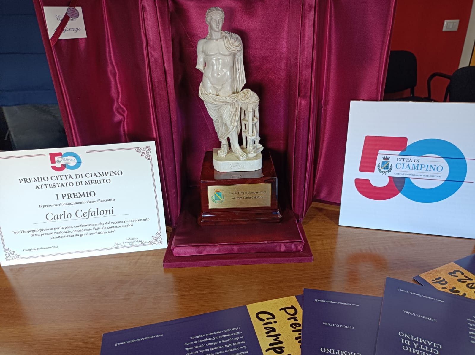 La cerimonia di conferimento si è svolta lunedì 18 dicembre nella sala Giunta, nel giorno della ricorrenza del 49esimo anniversario della costituzione di Ciampino in Comune autonomo, dando così ufficialmente il via ad un anno di festeggiamenti che si concluderanno il 18 dicembre 2024 con il traguardo dei 50 anni.