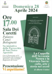 Vicovaro – Presentazione del libro “La Cappella dell’Avvocata Nostra e la Vicovaro Sacra” di Alberto Crielesi, domenica 28 aprile ore 17.00 presso la Sala dei Coretti (Palazzo Cenci Bolognetti).