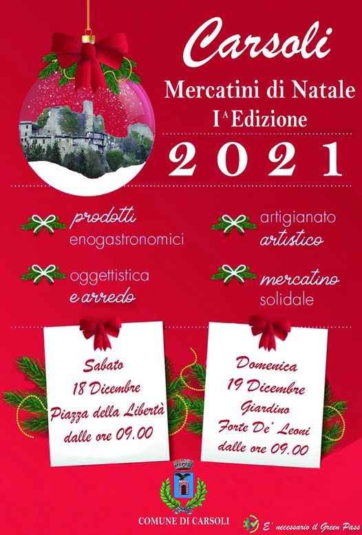 Carsoli – Una due giorni dedicata al Natale con la prima edizione dei Mercatini che saranno organizzati in due giorni, la prima in piazza della Libertà e la seconda giornata si svolgerà nella suggestiva cornice dell’Antica Fortezza recentemente restaurata. Il dettaglio evento.