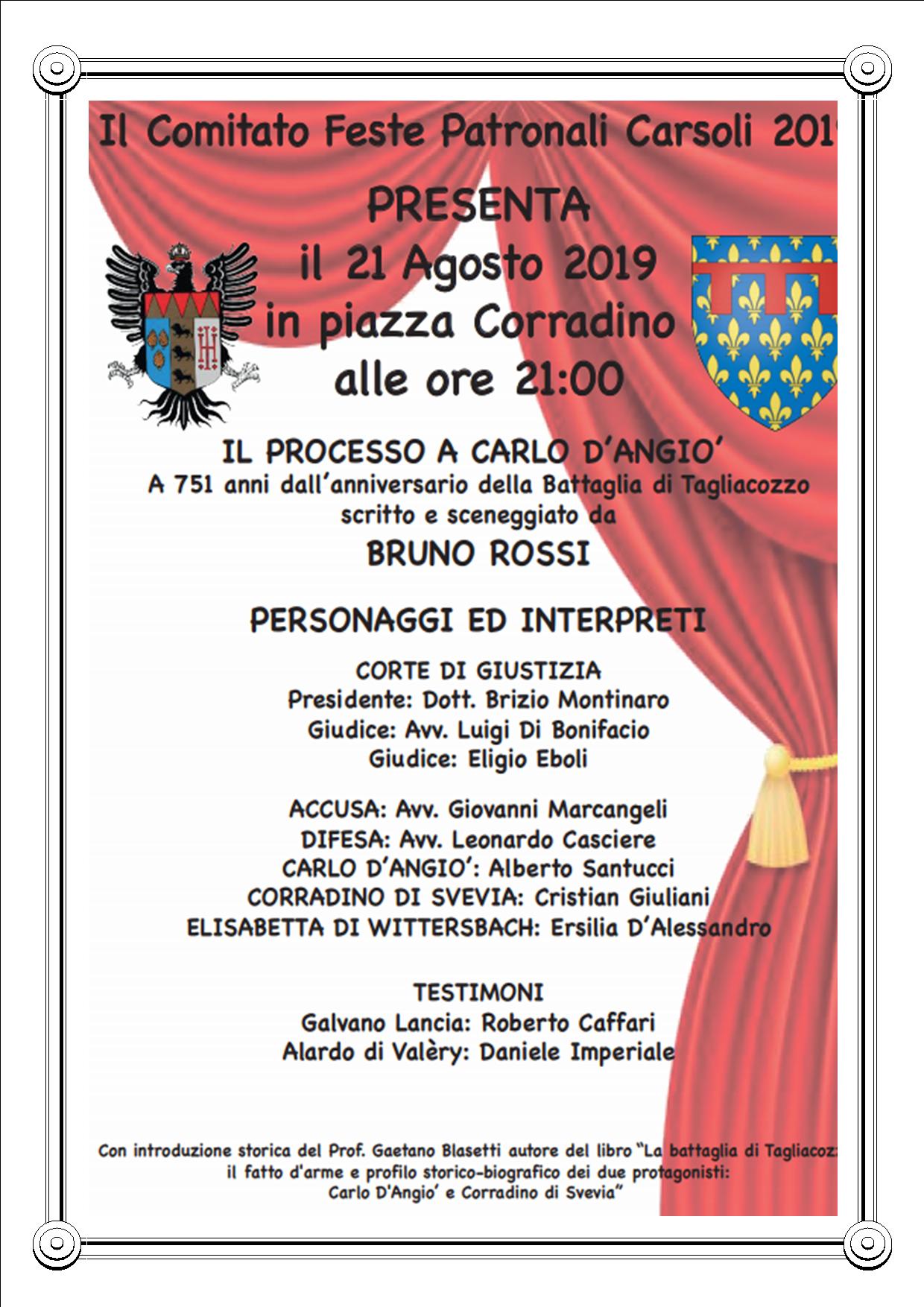 Carsoli – Indietro nel tempo con la rievocazione scenica della storia. L’appuntamento è a Carsoli nella suggestiva cornice di Piazza Corradino, quando la sera del 21 agosto 2019 alle ore 21.00 per iniziativa del comitato Feste Patronali 2019, andrà in scena l’opera teatrale “Processo a Carlo D’Angiò’ scritta e sceneggiata da Bruno Rossi. Il tutto in costumi d’epoca con un cast di protagonisti in cui è selezionata l’eccellenza istituzionale nella Marsica. La rappresentazione è dedicata al 751° anniversario della Battaglia di Tagliacozzo. La corte di giustizia sarà rappresentata dal Presidente dott. Brizio Montinaro, Giudice: Avv. Luigi Di Bonifacio con Eligio Eboli, Alberto Santucci che impersonerà Carlo D’Angiò. All’accusa l’avv. Giovanni Alberto Marcangeli, alla difesa l’Avv. Leonardo Casciere, il giovane e bello Christian Giuliani rappresenterà Corradino di Svevia, mentre Ersilia D’Alessandro sarà l’austera Elisabetta di Wittersbach, i testimoni in coppia: Galvano Lancia: Roberto Caffari e Alardo De Valery: Daniele Imperiale.