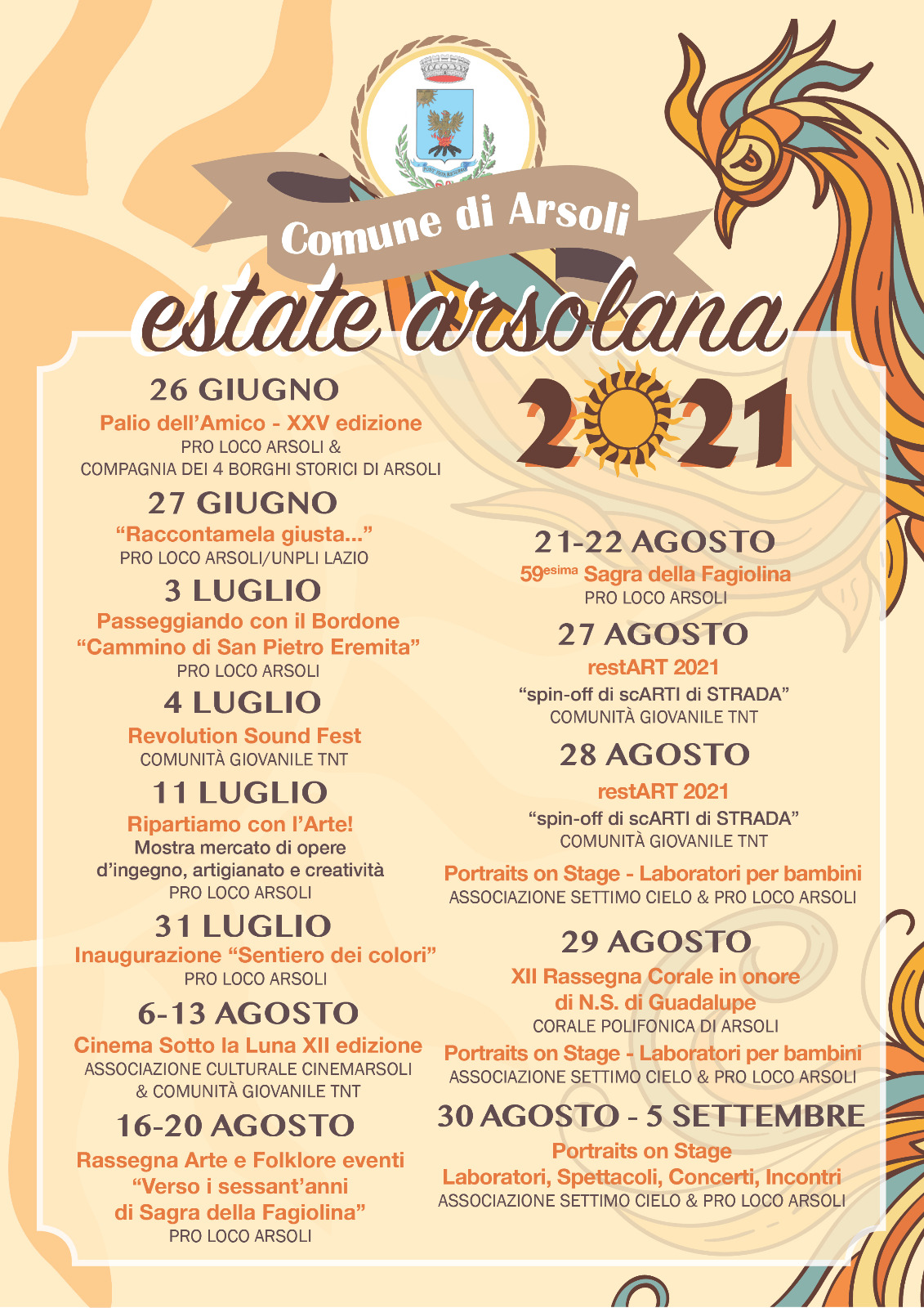 Arsoli – Proseguono le iniziative intraprese dal Comune di Arsoli per l’Estate Arsolana 2021: questo il programma degli eventi:
