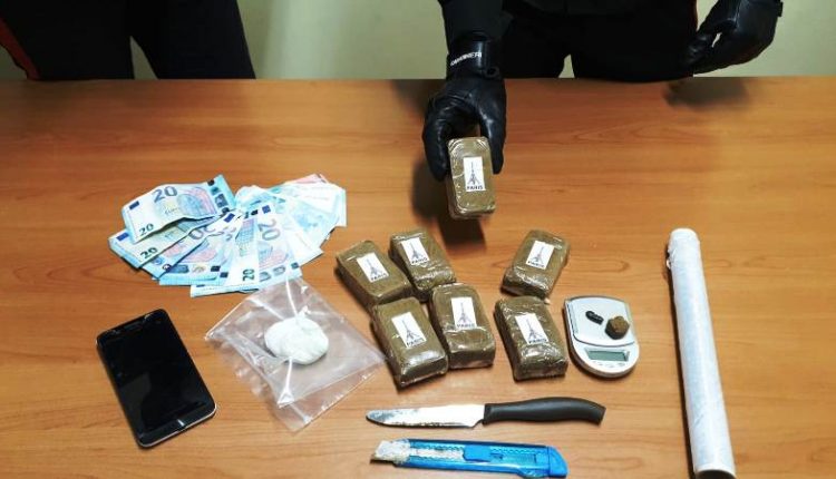 A seguito delle successive perquisizioni personali e domiciliari, i Carabinieri hanno rinvenuto e sequestrato 700 g di hashish, suddivisi in sette panetti da 100 g, e 70 g di cocaina, oltre a bilancini di precisione, materiale per il confezionamento e la somma contante di 250 euro, ritenuta provento dello spaccio.