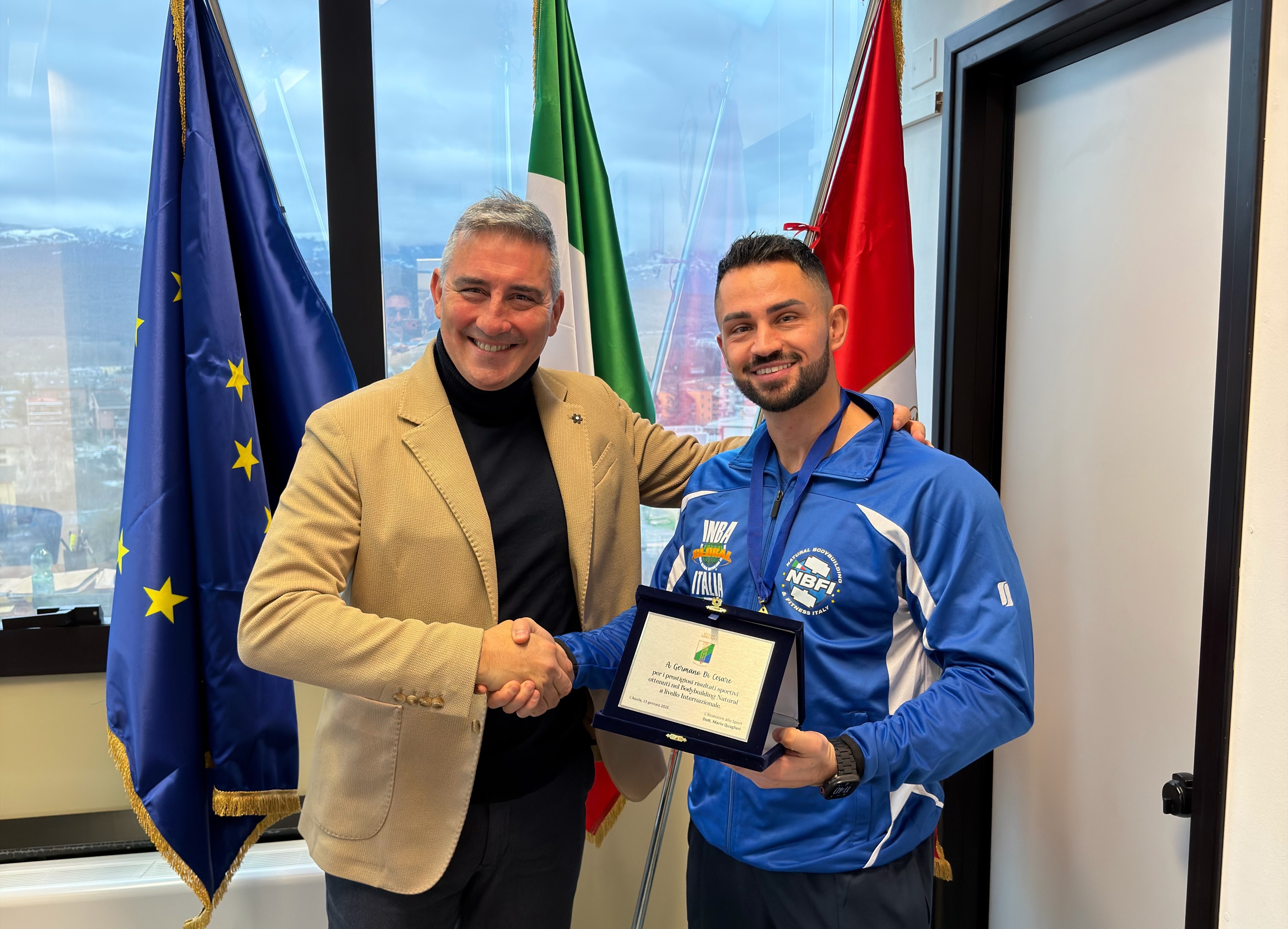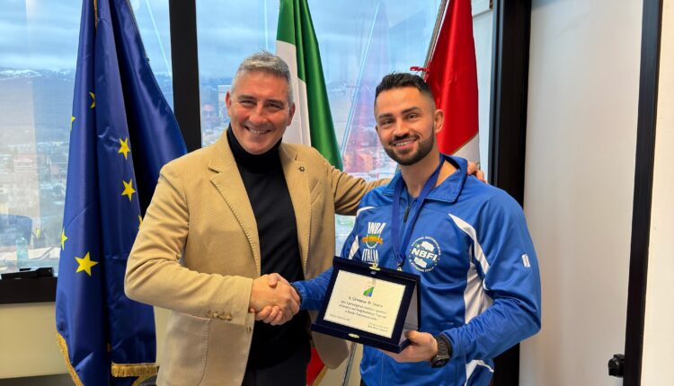 Certe vittorie non si misurano solo in medaglie, ma nel percorso umano che le rende possibili. È questo il significato della cerimonia che si è svolta a Palazzo Silone, sede della Regione Abruzzo, dove l’Assessore allo Sport Mario Quaglieri ha voluto premiare il Dott. Germano Di Cesare, biologo nutrizionista, per i suoi recenti successi internazionali nel natural bodybuilding.