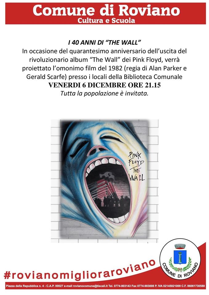 Il Comune di Roviano settore Cultura e Scuola ha voluto dunque celebrare questo evento di caratura internazionale a quarant’anni dall’uscita del famoso album. L’appuntamento è per venerdì sera 6 dicembre 2019 alle ore 21.15 presso la Biblioteca Comunale con la proiezione del film “The Wall” del 1982.  La partecipazione è aperta a tutti.