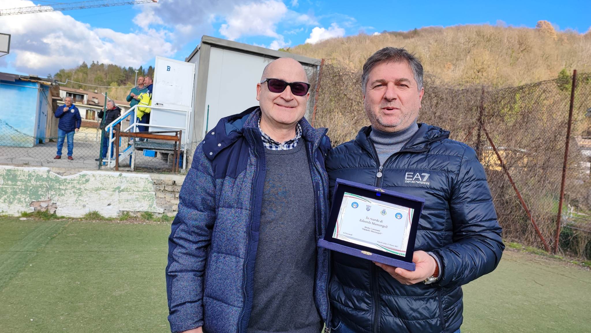 CARSOLI – Tanto pubblico, tanta partecipazione alla prima partita di questa giornata con caratterizzazione storica per lo sport. In campo al Marcangeli di Carsoli le squadre delle contigue regioni Lega Lazio e Abruzzo Under 15. Fischio d’inzio alle ore 15.00, in un clima amicale ma di decisa e scattante competizione calcistica. Al termine della gara, è stato ricordato Edoardo Marcangeli alla cui memoria è intitolato lo stadio, e la giornata odierna più che un memorial è stata caratterizzata come un ricordo a lui dedicato. Al termine della prima partita, sobria ed informale cerimonia di consegna targhe ed omaggi. I rappresentanti delle rispettive federazioni calcistiche Lazio Abruzzo hanno consegnato la targa per ricordo di Edoardo che è stata ritirata da papà Adelfo. Consegna seguita anche dalla targa dell’Asd Carsoli.