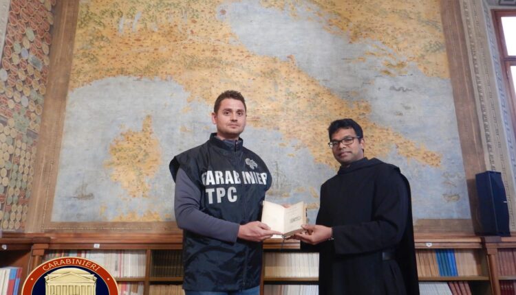 I Carabinieri del Nucleo TPC di L’Aquila hanno avviato la restituzione dei beni recuperati agli aventi diritto, come nel caso della riconsegna avvenuta a Parma presso la Biblioteca Monastica dei Padri Benedettini di San Giovanni Evangelista. Oggi, al termine di un incontro con gli studenti dell’Istituto “Domenico Cotugno” di L’Aquila, i Carabinieri TPC hanno riconsegnato alla dirigente scolastica il volume sequestrato. Queste occasioni sono proficue non solo per restituire ciò che è stato trafugato nel tempo e in circostanze ignote, ma anche per infondere la cultura della legalità nelle giovani generazioni.