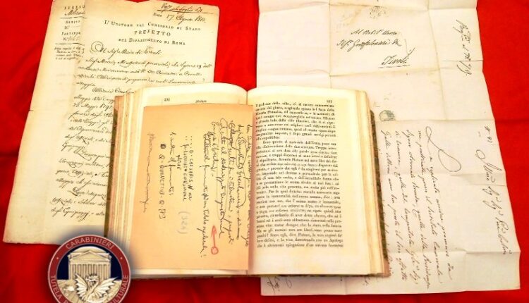 TIVOLI – presso la Sede comunale, alla presenza del Sindaco di Tivoli, Dott. Giuseppe PROIETTI, e del Responsabile dell’Archivio Storico Comunale, Dott. Mario MARINO, i Carabinieri del Nucleo per la Tutela del Patrimonio Culturale (TPC) di Roma, hanno restituito due documenti archivistici e un libro antico risalenti alla prima metà del XIX secolo, trafugati in data imprecisata dall’Archivio Storico e dalla Biblioteca di quel centro.