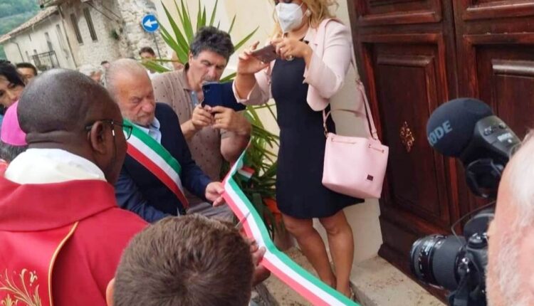 COLLE DI TORA – Il taglio del nastro è stato vissuto con emozione a Colle di Tora per la attesa riapertura in grande stile della Chiesa di San Lorenzo. Forbice al sindaco Otello Loreti, al Vescovo di Rieti Mons. Domenico Pompili, al presidente della Provincia di Rieti Mariano Calisse. Dopo la riapertura della porta è stata celebrata la Santa Messa Solenne. Presente anche il consigliere provinciale Chiara Simonetti.