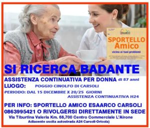 SI RICERCA BADANTE PER donna anziana di anni 87 -Luogo: Poggio Cinolfo di Carsoli