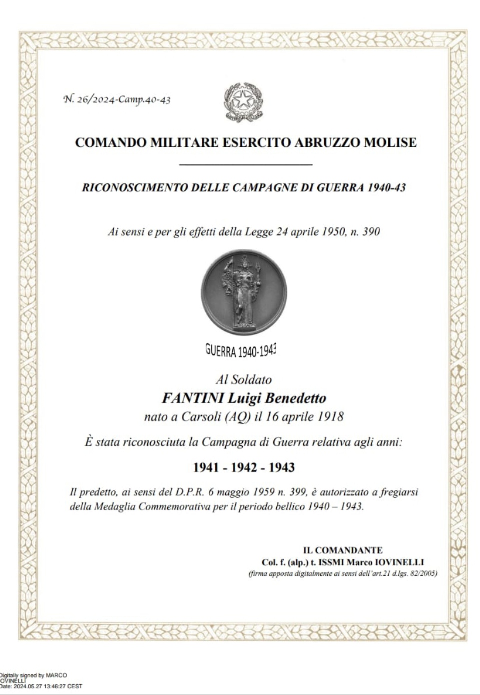 CHIETI – Il comando militare dell’Esercito Abruzzo e Molise ha riconosciuto ufficialmente la campagna di guerra per gli anni 1941, 1942 e 1943 alla memoria del soldato Luigi Fantini, nato a Carsoli il 16 aprile 1918. Il piastrino del soldato venne recuperato da Roberto Venturini, alpino friuliano che poi ha avviato le ricerche. La medaglia commemorativa è stata consegnata alla famiglia,