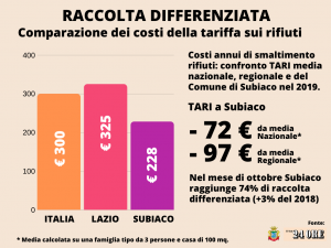A confermare l’andamento dei dati anche la cifra di raccolta differenziata raggiunta a Subiaco, che nel mese di ottobre a Subiaco si conferma stabile sopra il 74%, ampiamente sopra gli standard europei. Tale risultato, raggiunto con soli 3 anni di raccolta differenziata porta a porta, oltre a rappresentare un vantaggio economico (), rappresenta una notevole riduzione del conferimento in discarica, con 233mila kg in meno nel solo mese di ottobre.