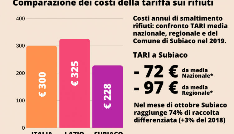 Subiaco – Da uno studio della rivista “Il Sole 24 Ore”, il costo dei rifiuti a famiglia varia notevolmente da nord a sud. Confrontando il costo medio annuo in Italia (300 euro) e della Regione Lazio (325 euro), la bolletta TARI a Subiaco si attesa sulle 228 euro, quindi 72 euro in meno rispetto alla media nazionale e 97 rispetto a quella regionale.