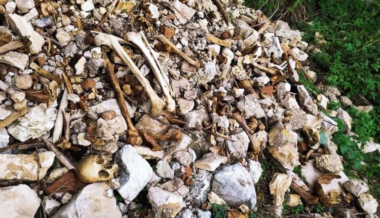 Stando alle segnalazioni ricevute, i resti umani si trovano a cielo aperto da tempo, e provengono dalla distruzione di antiche tombe ed ossari situati in prossimità della Chiesa di Santa Maria delle Grazie, unico edificio che venne risparmiato dalle fiamme e nel quale ebbero a trovare riparo i cameratani dell’epoca.