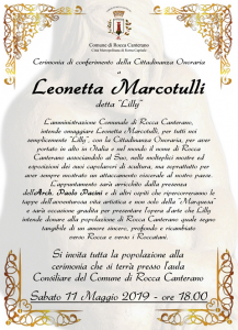 Rocca Canterano – Grande attesa a Rocca Canterano per il conferimento ufficiale della cittadinanza onoraria all’artista Leonetta Marcotulli detta Lilly. Una occasione per tributare alla stessa il riconoscimento delle sue capacità artistiche ed espressive che in Italia e nel mondo hanno dato lustro a Rocca Canterano. Il cerimoniale ufficiale si svolgerà sabato 11 maggio alle ore 18.00 presso la Sala Consiliare del Comune. Sarà presente anche l’Arch. Paolo Pacini che ripercorrerà tutte le tappe della storia della nota artista che nel corso della sua vita si è fatta apprezzare in ogni dove.