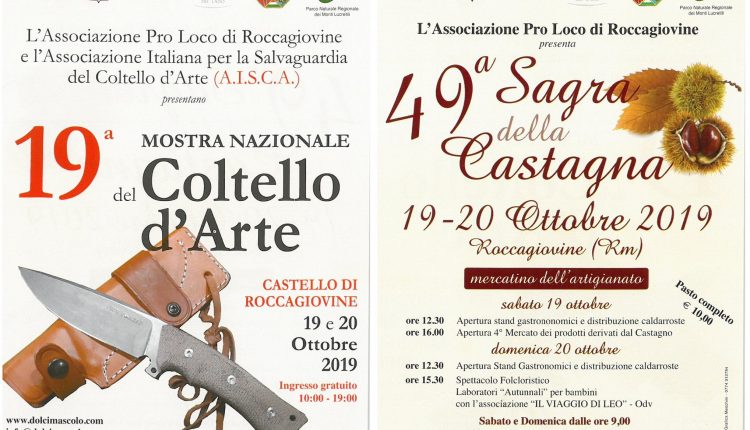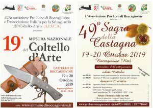 Roccagiovine – Nella suggestiva cornice autunnale di Roccagiovine Sabato 19 e Domenica 20 ottobre avrà luogo la quarantanovesima Sagra della Castagna e nelle stesse giornate la A.I.S.C.A. (Associazione Italiana per la Salvaguardia del Coltello d’Arte) allestisce la 19^ Mostra Nazionale del Coltello d’Arte.