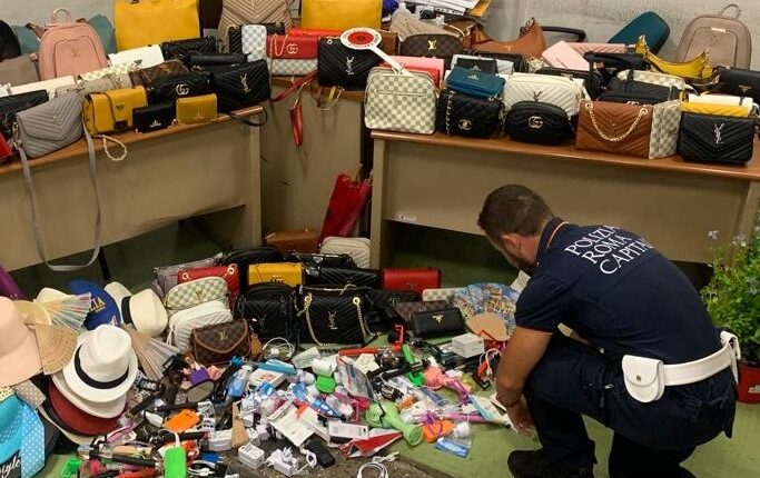 Oltre 300 gli articoli che sono stati posti sotto sequestro, nel solo pomeriggio di ieri nella zona di Castel S. Angelo, da parte dei nostri agenti del I Gruppo Prati. Tra la merce sequestrata ombrelli, gadget, accessori per telefonia e oltre 100 borse contraffatte di noti brand della moda.