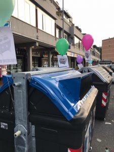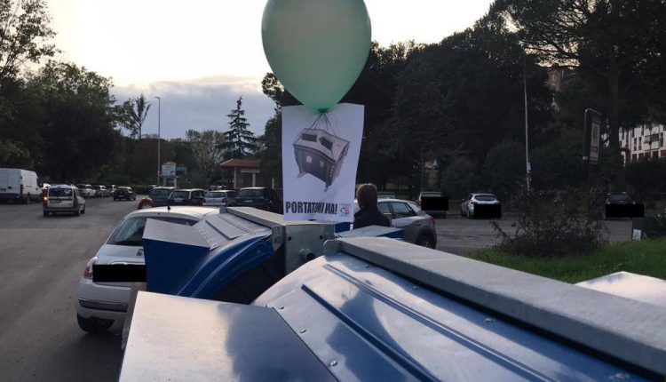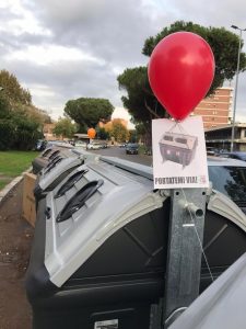 Alcuni palloncini colorati, rigorosamente biodegradabili, sono stati lasciati attaccati ai cassonetti. Il messaggio rivolto all’Ama e al Comune appeso ai palloncini è eloquente: “Portatemi Via”.