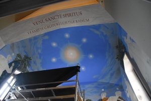 Il parroco don Maurizio Mirilli – noto per i suoi libri tra cui “Un briciolo di gioia…purché sia piena” con premessa di Papa Francesco (ed. San Paolo, 2018) – ha pensato di far dipingere al maestro Rodolfo Papa il tema della Pentecoste nella cappella del Perdono, dove solitamente è collocato il quadro con la Madonna del Perdono, immagine su legno molto venerata nella comunità parrocchiale.