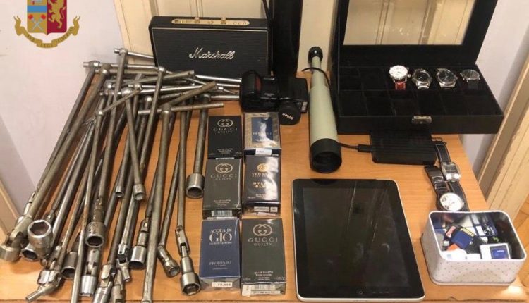 Perquisendo l’auto sono stati sequestrati 2 orologi e 20 chiavi inglesi a “T” di varie misure. Nell’auto c’era un mazzo di chiavi, non riconducibili all’abitazione “ufficiale” del 41enne. I poliziotti, convinti che quelle chiavi aprissero il vero deposito del ricettatore, hanno iniziato un lavoro certosino che, con non poca difficoltà, li ha portati ad individuare un appartamento all’interno del quale è stata trovata un’amica del fermato. Perquisendo quest’abitazione gli investigatori hanno sequestrato vari profumi, diverso materiale informatico e 4 orologi, di cui uno di notevole valore.