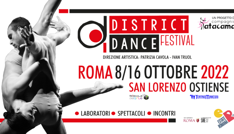 Roma – Dall’8 al 16 ottobre arriva a Roma la prima edizione di District Dance Festival, kermesse dedicata alla danza contemporanea, ideata e organizzata dalla compagnia Atacama di Patrizia Cavola e Ivan Truol: oltre 10 eventi, tra laboratori, spettacoli e incontri che avranno luogo presso il Teatro Marconi, spazio multidisciplinare nel quartiere Ostiense e la Scatola dell’Arte di San Lorenzo. District Dance Festival è un progetto promosso da Roma Capitale – Assessorato alla Cultura, ed è vincitore dell’Avviso Pubblico “Estate Romana 2022 – Riaccendiamo la Città, Insieme” curato dal Dipartimento Attività Culturali ed è realizzato in collaborazione con SIAE.