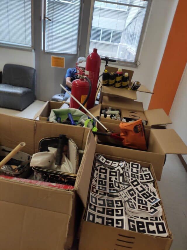 Nel corso delle indagini sono stati rinvenuti e posti sotto sequestro più di 1000 adesivi, decine di bombolette spray, attrezzi tecnici come funi da arrampicata o estintori modificati come diffusori da vernice, oltre a pc e apparecchiature elettroniche.