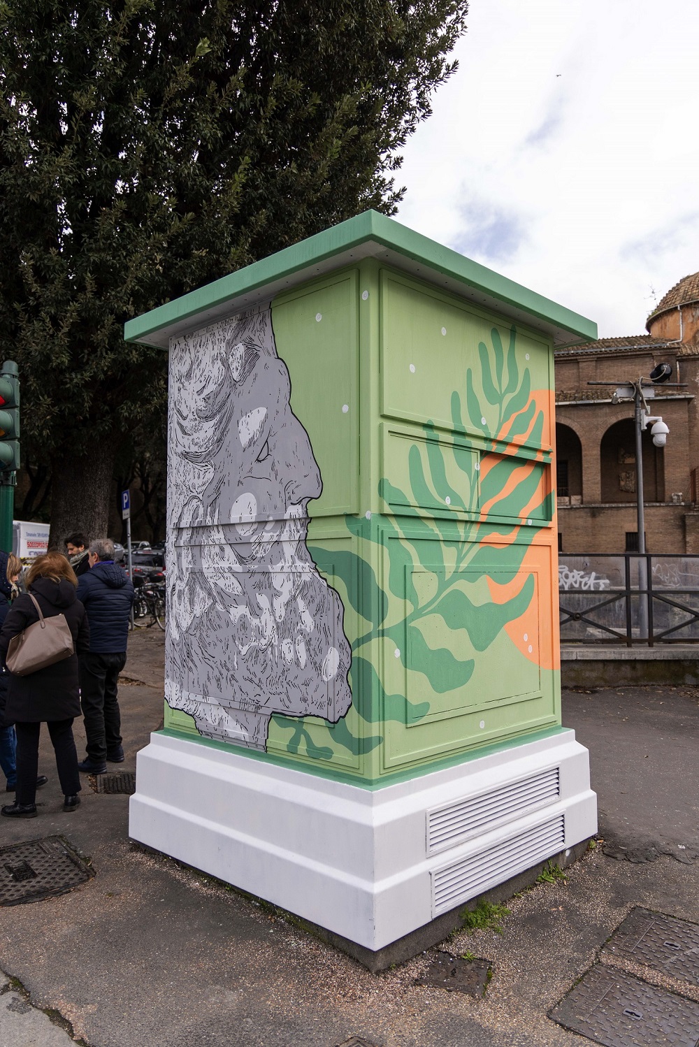 Nei prossimi giorni verranno conclusi anche gli altri 5 interventi artistici sulle rispettive cabine dismesse: sulla Cabina 1 in Piazza Vittorio Emanuele II (Municipio I) l’opera Up to You di BiceLuna (Federica Mancini); sulla Cabina 3 in Via Casilina/Via di Tor Pignattara (Municipio V) il lavoro Rifiorire di NIAN (Eugenia Chiasserini); sulla Cabina 4 in Piazzale Labicano (Municipio VII) l’opera Al suono di Roma di Leonardo Crudi; sulla Cabina 5 in Circonvallazione Gianicolense/Via Ottavio Gasparri (Municipio XII) l’intervento The Pinkish Box di Vittorio Pannozzo; sulla Cabina 6 in Piazza di Villa Carpegna (Municipio XIII) l’opera Pattern Geometrico di MOTOREFISICO (il duo Lorenzo Pagliara e Gianmaria Zonfrillo).