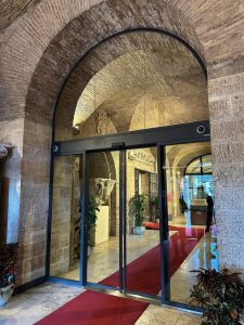 L’intervento principale ha previsto la completa sostituzione della bussola d’ingresso presente nell’atrio, del posto di guardia e dello spogliatoio del personale addetto ai controlli. Elevati standard di sicurezza sono stati assicurati grazie all’impiego di materiali ed elementi architettonici ad alta resistenza e di elevata qualità estetica, nel pieno rispetto della monumentalità e del valore storico dei luoghi. È stata realizzata una struttura in metallo autoportante costituita da travi di supporto ai telai delle porte di accesso e degli infissi. La postazione della guardiania, infine, è stata riorganizzata in modo da permettere una maggiore funzionalità, con un sistema interamente automatizzato per il controllo degli ingressi.