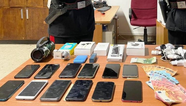 Dopo un breve inseguimento a piedi, i militari hanno bloccato il 28enne e lo hanno sottoposto ad una perquisizione. Nello zaino in suo possesso, i Carabinieri hanno rinvenuto 12 telefoni cellulari di varie marche e modelli, diversi modelli di cuffie e casse bluetooth, una macchina fotografica digitale, vari caricabatterie, nonché la somma di 520 euro in contanti. Tra il denaro trovato in suo possesso è stata trovata anche una banconota da 100 euro palesemente contraffatta.