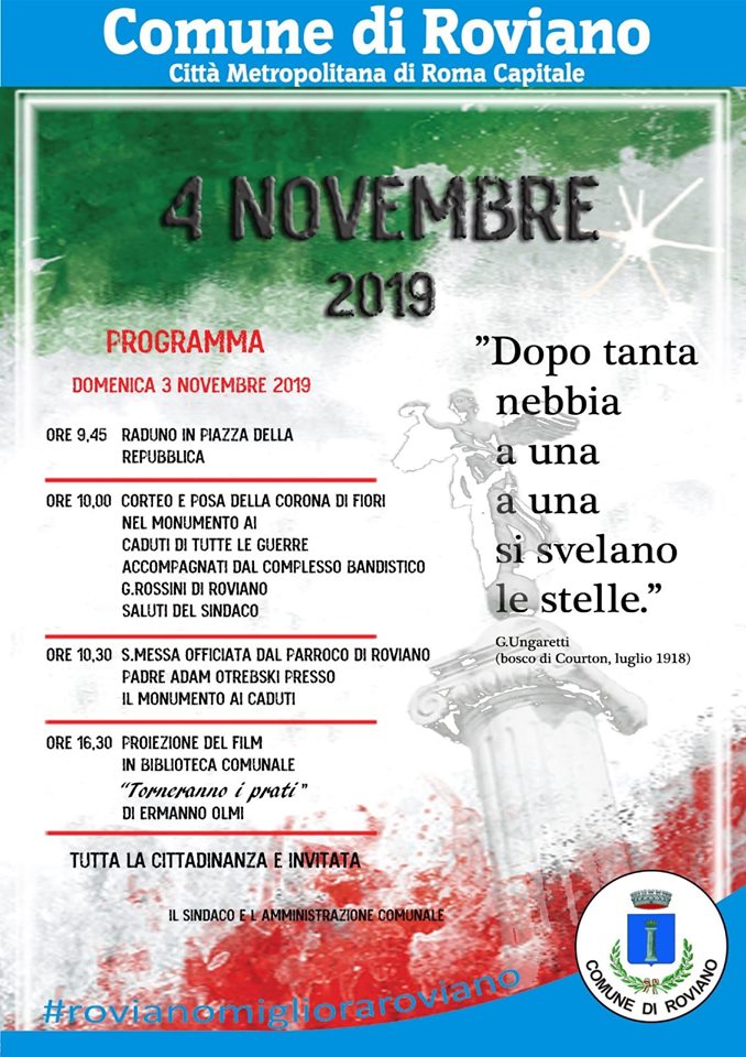 In occasione delle celebrazioni della fine della Prima Guerra mondiale, l’Amministrazione Comunale di Roviano è lieta di invitare la popolazione alla giornata di manifestazione per onorare i Caduti in guerra per la libertà e per la democrazia, e per ricordare che la pace è un bene da difendere.