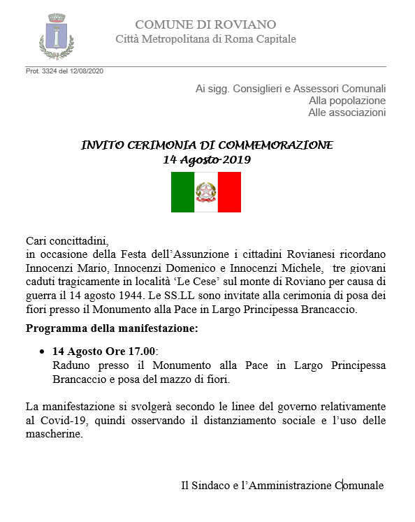Con l’occasione saranno ricordati i tre cittadini rovianesi periti il 14 agosto 1944 nella seconda guerra mondiale.