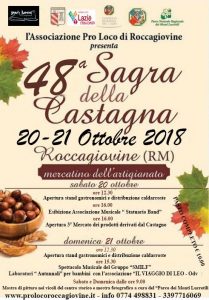 Roccagiovine – Sabato 20 e Domenica 21 ottobre si terrà la tradizionale “Sagra della Castagna” e la “Mostra del Coltello d’Arte”. Nel corso dell’evento ci saranno stand gastronomici e il mercatino dell’artigianato.