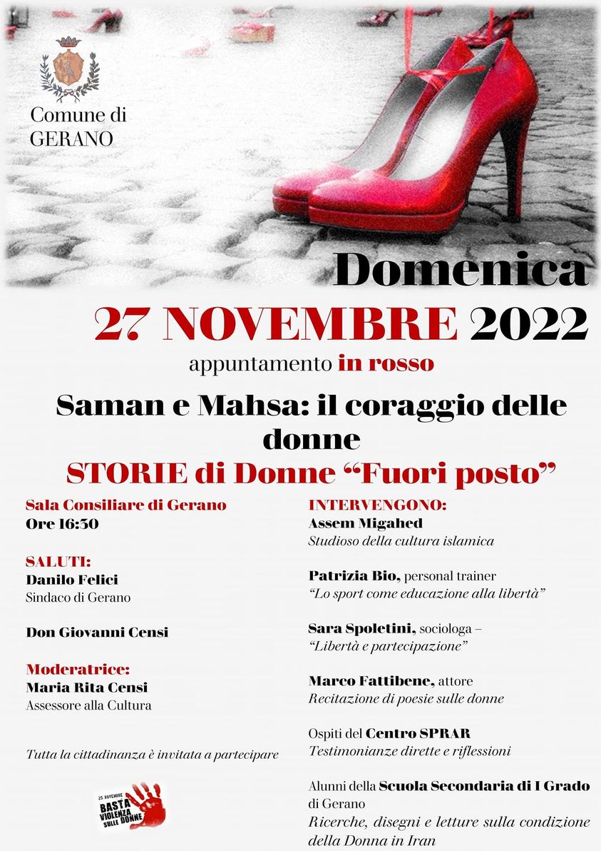 Il comune di Gerano, per ricordare queste e tante altre storie di donne coraggiose e “fuori posto”, terrà una conferenza dal titolo “Saman e Mahsa: il coraggio delle donne. Storie di donne fuori posto”, per ricordarle e parlare di questo tema di grande attualità in occasione della Giornata Mondiale per l’eliminazione della violenza contro le donne.