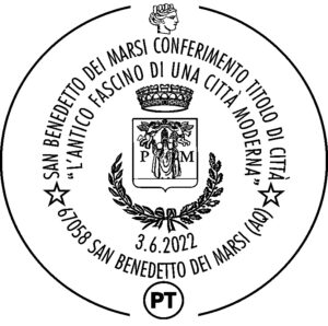 Completano l’annullo le scritte «San Benedetto dei Marsi Conferimento Titolo di Città», «L’antico fascino di una città moderna» e «3.6.2022 – 67058 San Benedetto dei Marsi (AQ)».