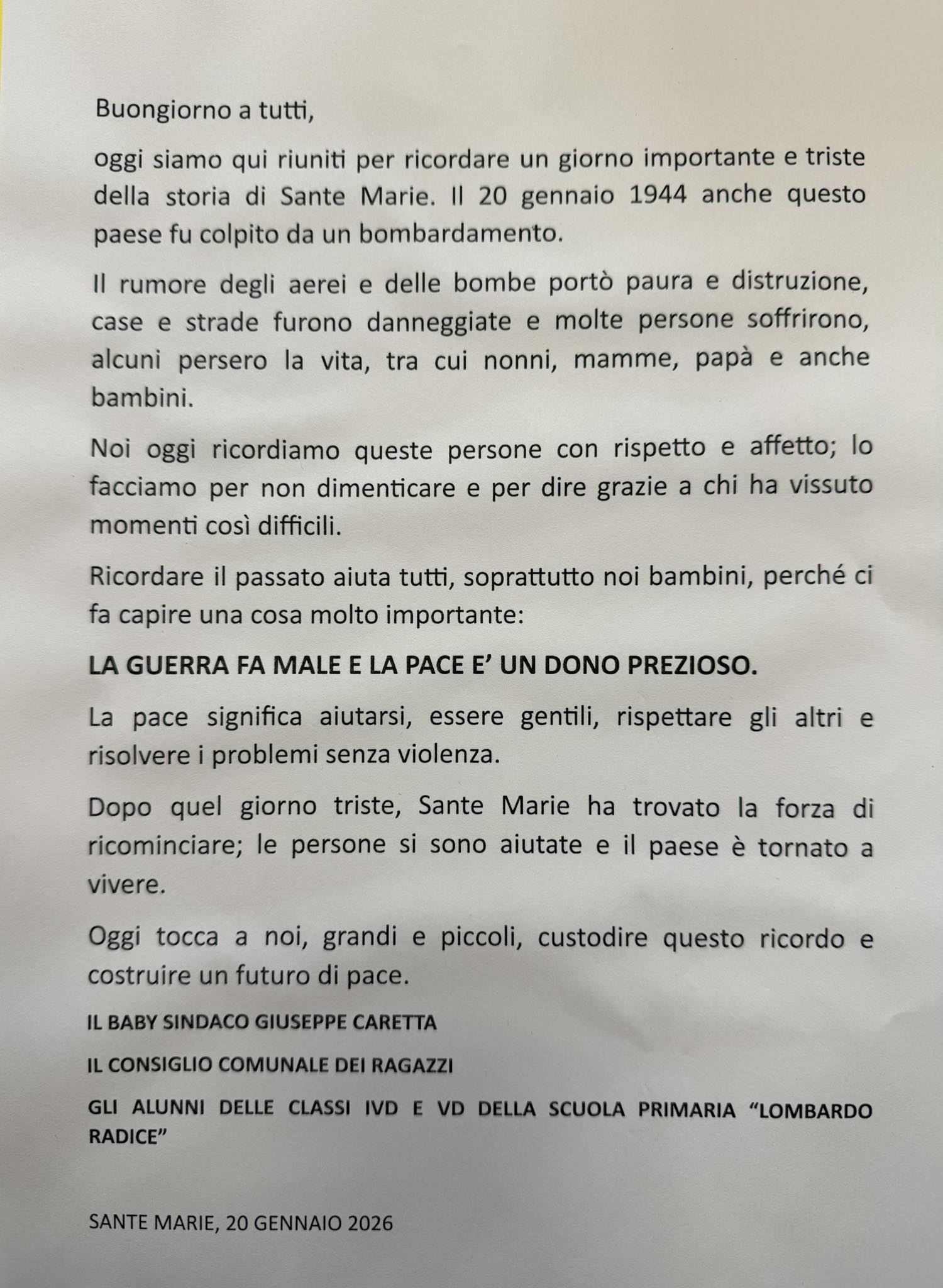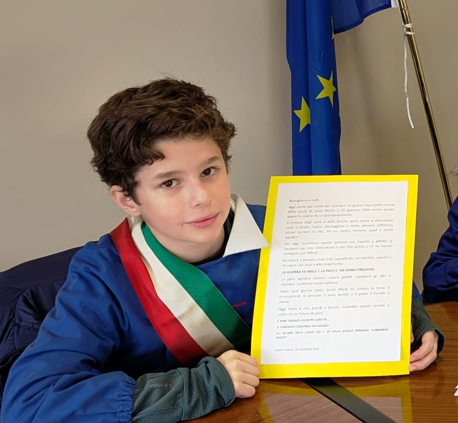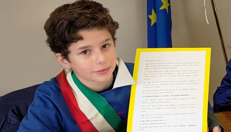 Momento più emozionante della cerimonia è stato il discorso del baby sindaco Giuseppe Caretta, che con mano tremante ma decisa ha letto una lettera scritta di suo pugno. Nel suo messaggio, il giovane primo cittadino ha ricordato l’orrore della guerra e l’importanza della memoria: