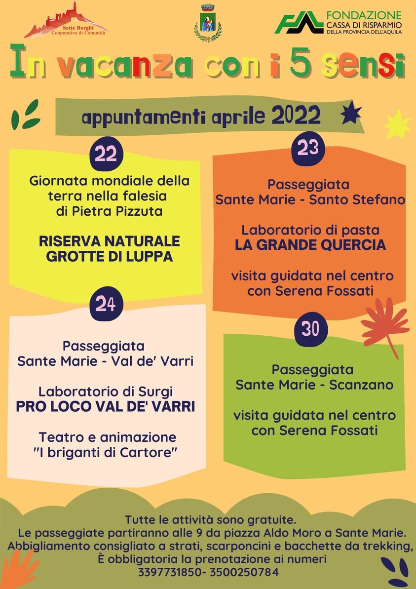 Tutte le attività sono organizzate dalla cooperativa di comunità “Sette borghi” e sono gratuite, fino a esaurimento posti. Le passeggiate partiranno tutte alle 9 da piazza Aldo Moro a Sante Marie. È consigliato un abbigliamento consigliato a strati, scarponcini e bacchette da trekking, acqua e zaino. In caso di maltempo gli eventi saranno rinviati. È obbligatoria la prenotazione ai numeri 3397731850- 3500250784
